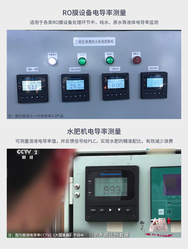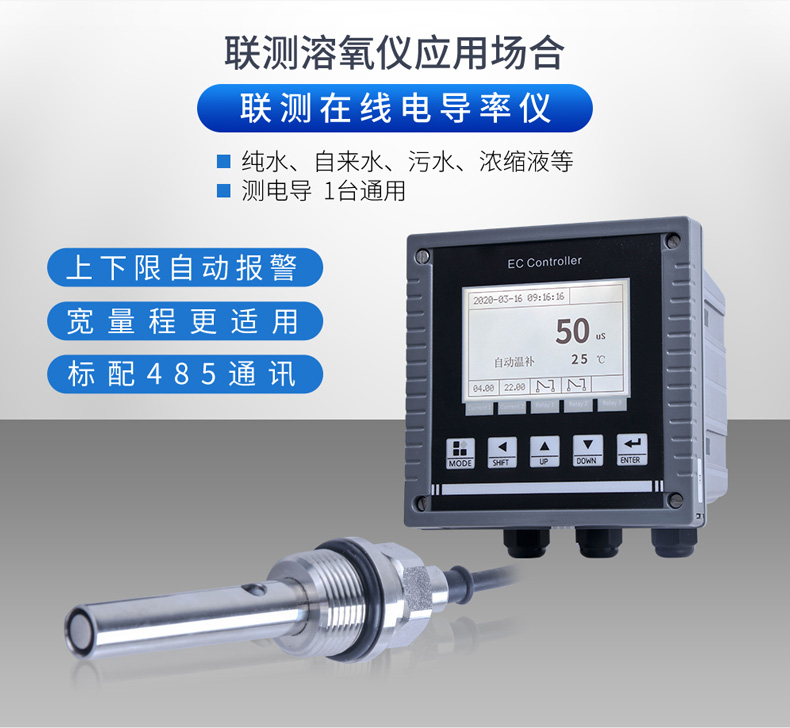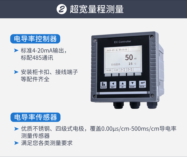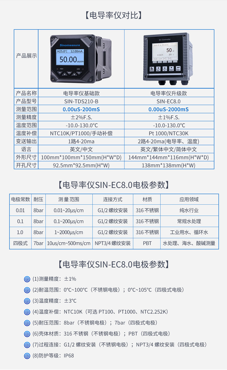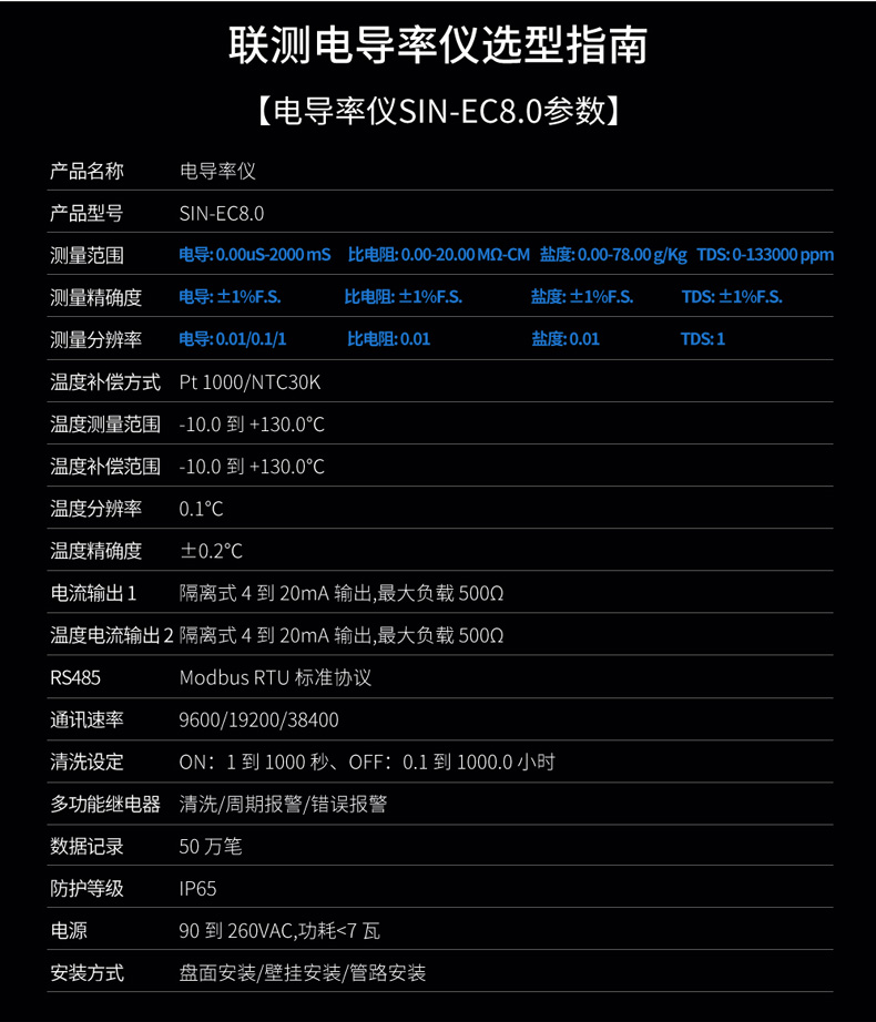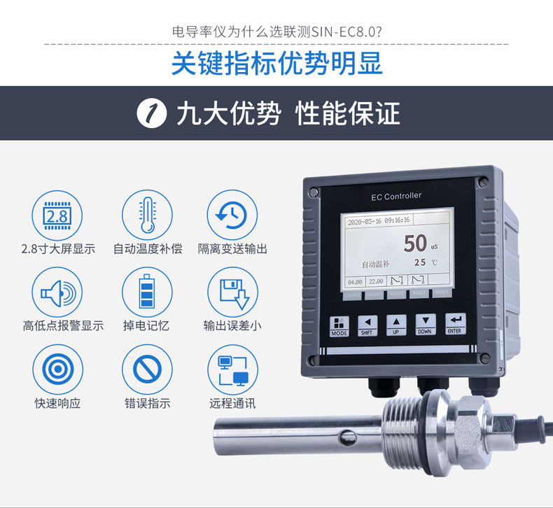 產品簡介:SIN-EC8.0工業電導率儀表,大屏顯示,可對各種工業用水的電導率(TDS)值進行連續測量和控制,本裝置廣泛應用于科學實驗裝備、化工、制藥、環保、冶金、造紙、食品、飲料及供水等行業。根據水工業的環境和特點結合國際供電標準,考慮了特殊環境的電氣設計規范,增加了220VAC供電。
