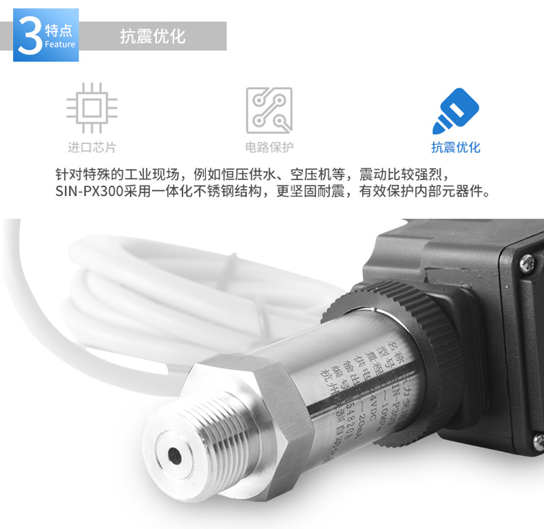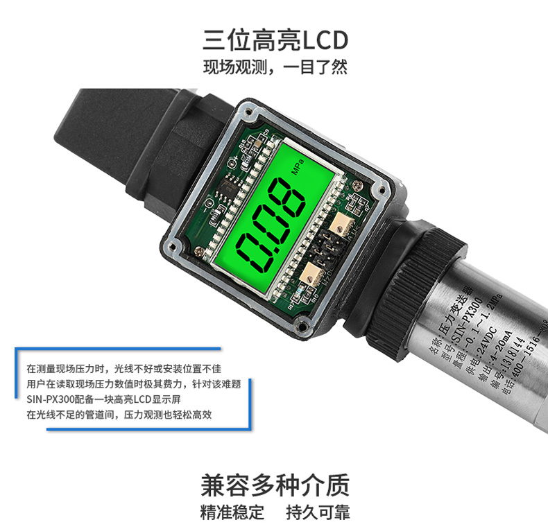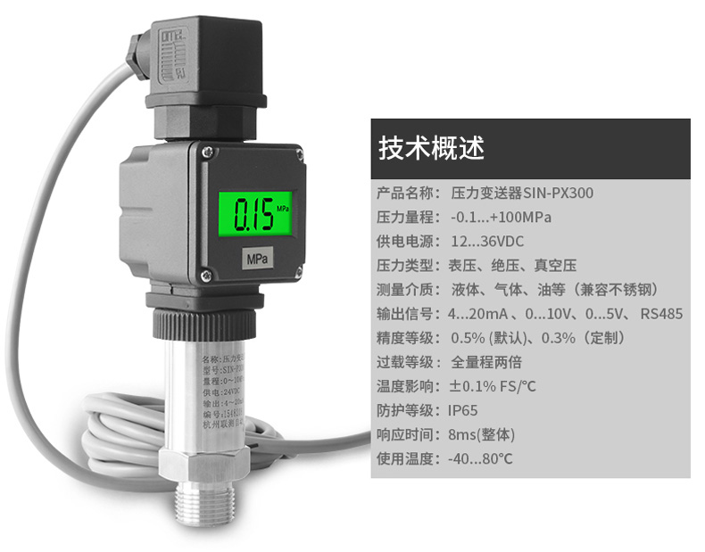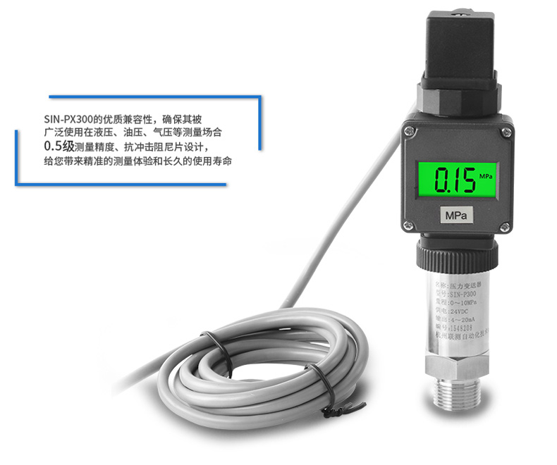 產品簡介:SIN-PX300型數顯壓力變送器采用無縫焊接結構,可批量化生產,經濟、可靠,具有良好的適應性,可應用于各種復雜的環(huán)境,該產品輸出形式多樣,壓力接口可提供定制,滿足您的使用需求。同時數顯壓力變送器帶有現場顯示功能,能夠更加直觀的顯示現場的壓力波動情況。廣泛應用于工業(yè)自動化設備配套以及石油、化工、冶金、電力等控制領域。