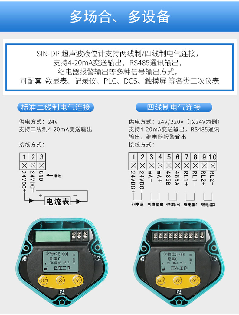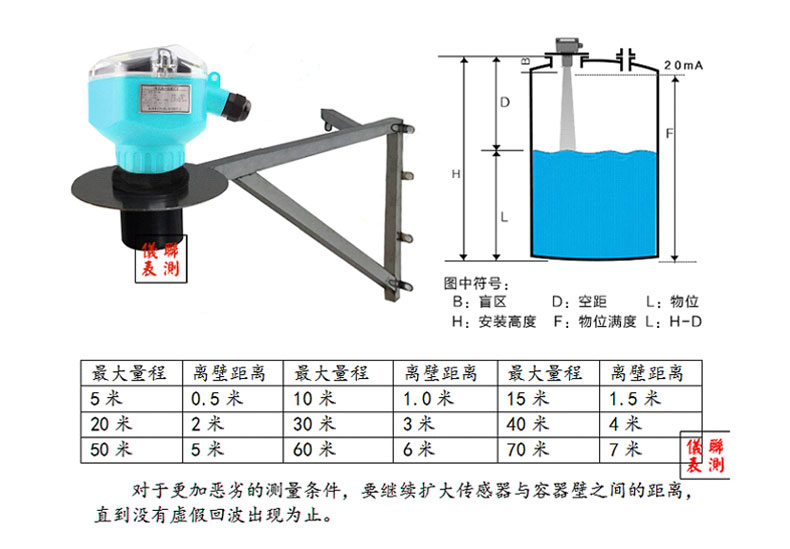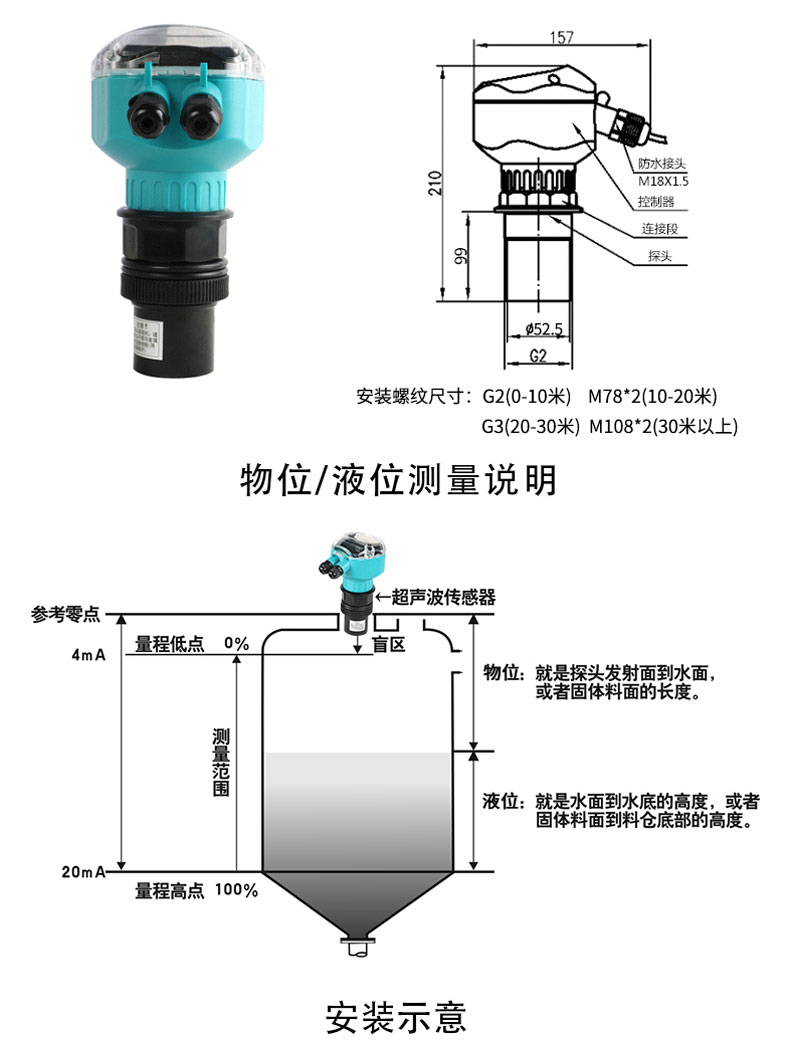 產品簡介:在測量中超聲波脈沖由傳感器(換能器)發出,聲波經液體表面反射后被同一傳感器接收或超聲波接收器,通過壓電晶體或磁致伸縮器件轉換成電信號,并由聲波的發射和接收之間的時間來計算傳感器到被測液體表面的距離。 由于采用非接觸的測量,被測介質幾乎不受限制,可廣泛用于各種液體和固體物料高度的測量。